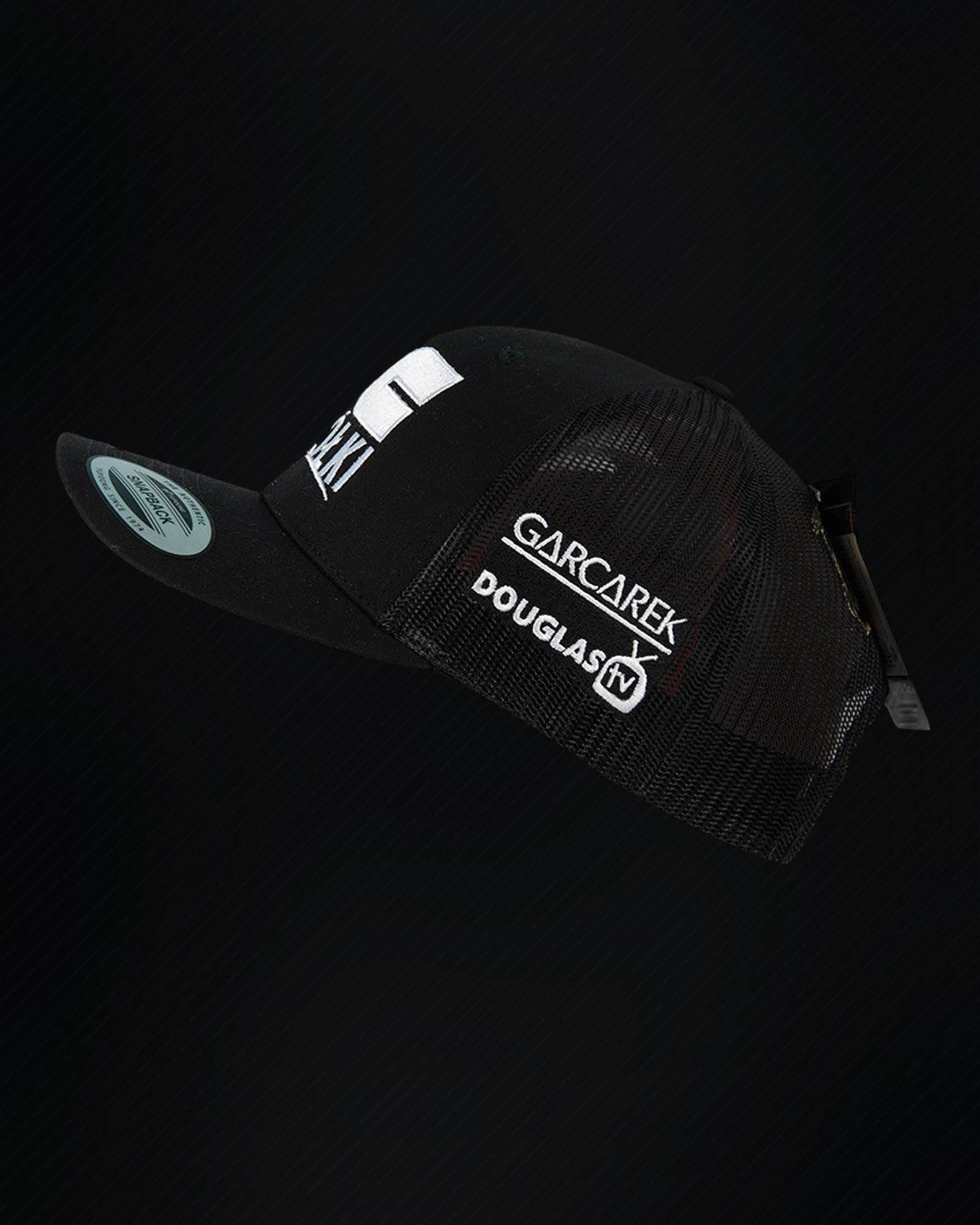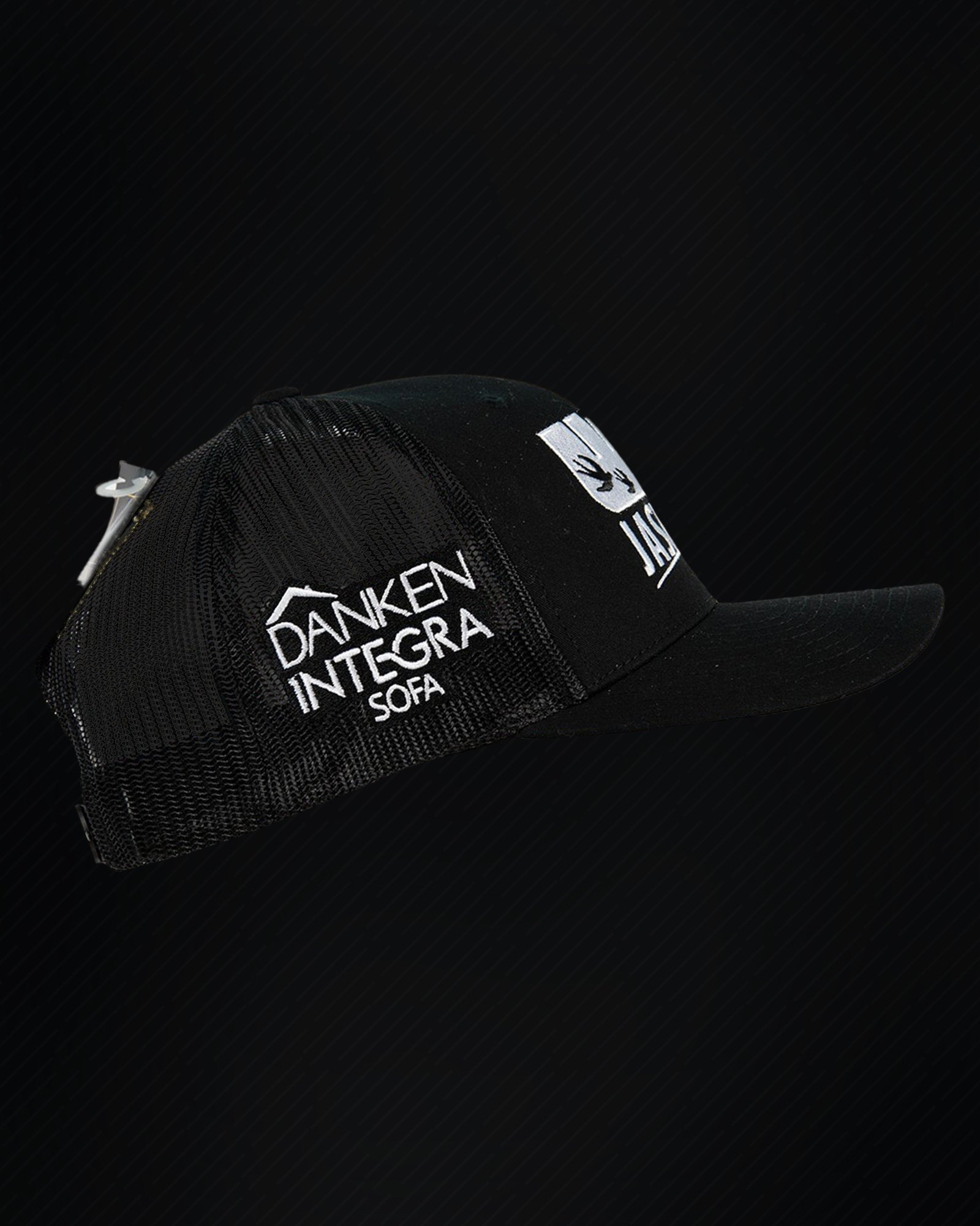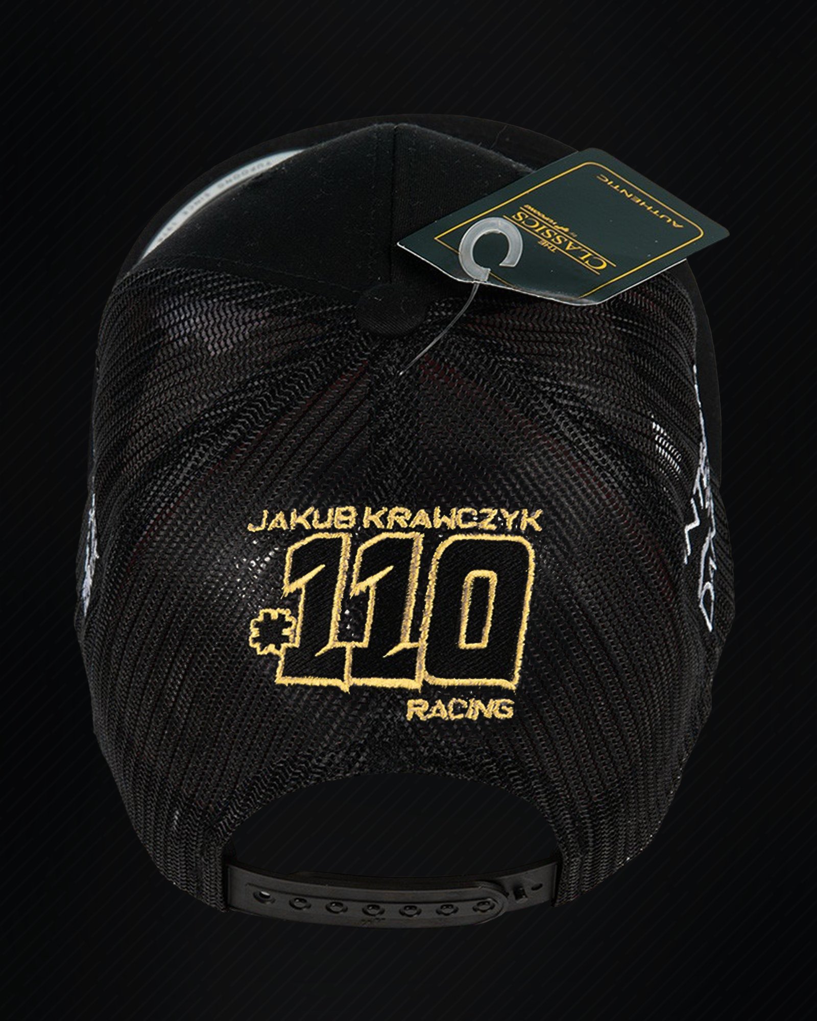 Klasyczna czarna czapka typu Flexfit Retro Trucker 🧢 Przód i boki zdobią loga sponsorów, a z tyłu znajduje się charakterystyczne moje logo #JK110 🔥